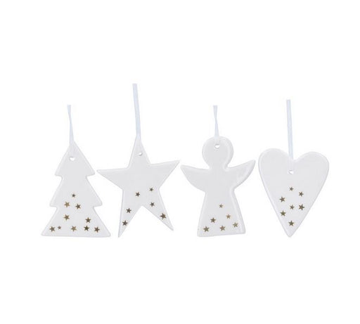 A cute set of four small white porcelain hanging decorations with gold star design. Shapes include an angel, Christmas tree, heart, and star. The p...