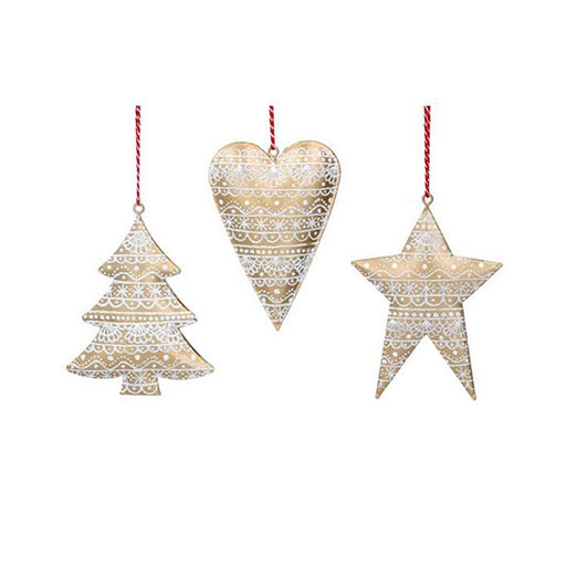 A lovely trio of gold shaped hanging decorations. Shapes include a tree, heart and star, decorated with an attractive white lace design. The perfec...